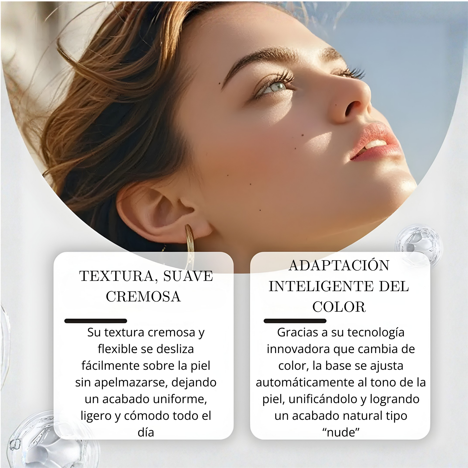 Base 2 en 1 con tecnología de cambio de color que se ajusta automáticamente a tu tono para un acabado natural, uniforme y sin grietas. Su textura ligera hidrata, ilumina y cuida la piel durante todo el día ✨